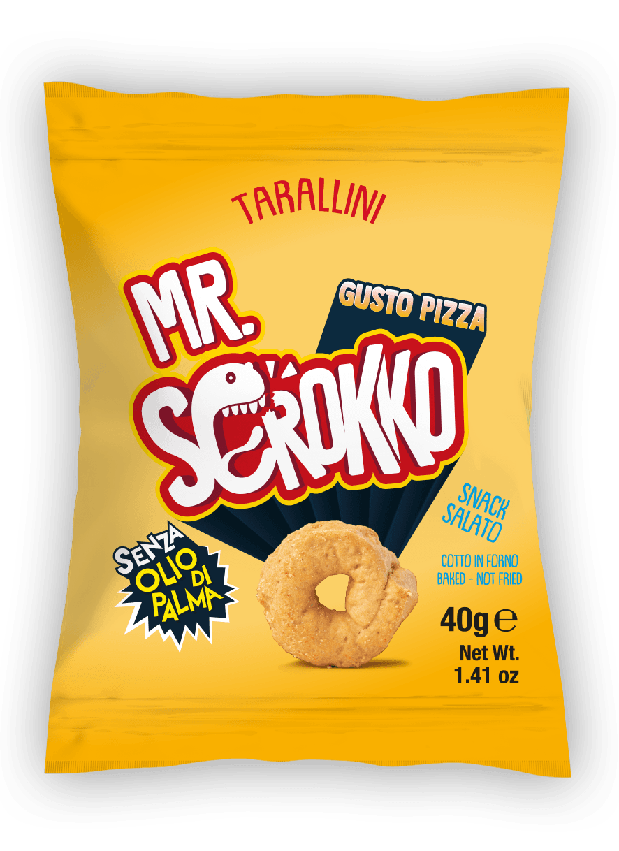 Snacki Mr.Scrokko Tarallini Pizza to chrupiące, słone przekąski o smaku pizzy, w charakterystycznym kształcie pierścienia. Jest to praktyczna, uniwersalna i szybka przegryzka na każdą okazję.